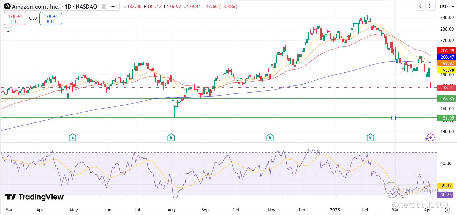 Amazon (AMZN) is nearing one of its lower which happened in August 2024 ($170), so whether there will be some successful negotiation for the tariffs hitting AMZN remain to be seen, but that could present a good point of purchase. I have purchased AMZN at one of its lows near $175.