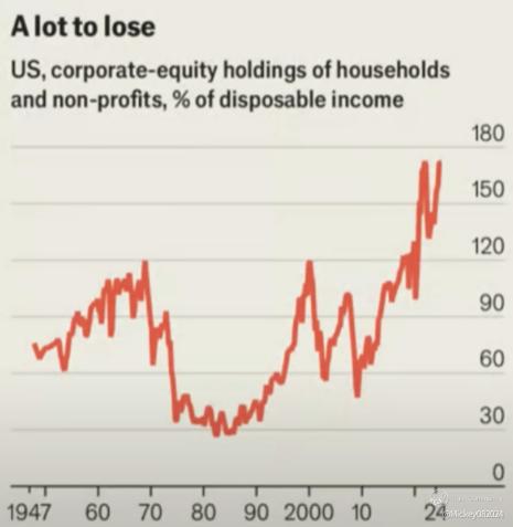 Here’s what no one is talking about: U.S. households today hold over 170% of their disposable income in equities. That’s a staggering amount of wealth tied to a single asset class—and it’s now falling week after week.