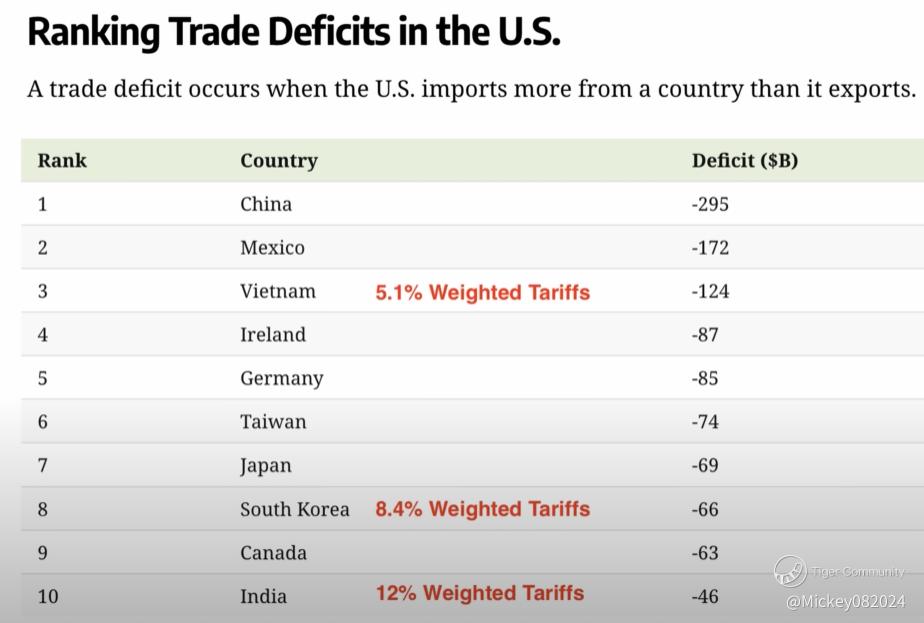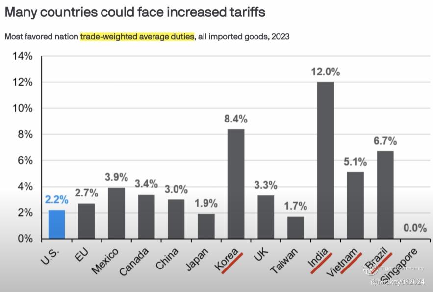 Now, if we examine trade-weighted average tariffs—which measure the real effective tariff rates across all imports—countries like South Korea, India, Vietnam, and Brazil are in the danger zone. Korea's average is over 8%, India’s is a staggering 12%. These nations are now top targets for reciprocal tariffs.