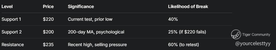 • Support Levels: $220 has held as support since late March, but volume is thinning—signaling weak buying conviction.