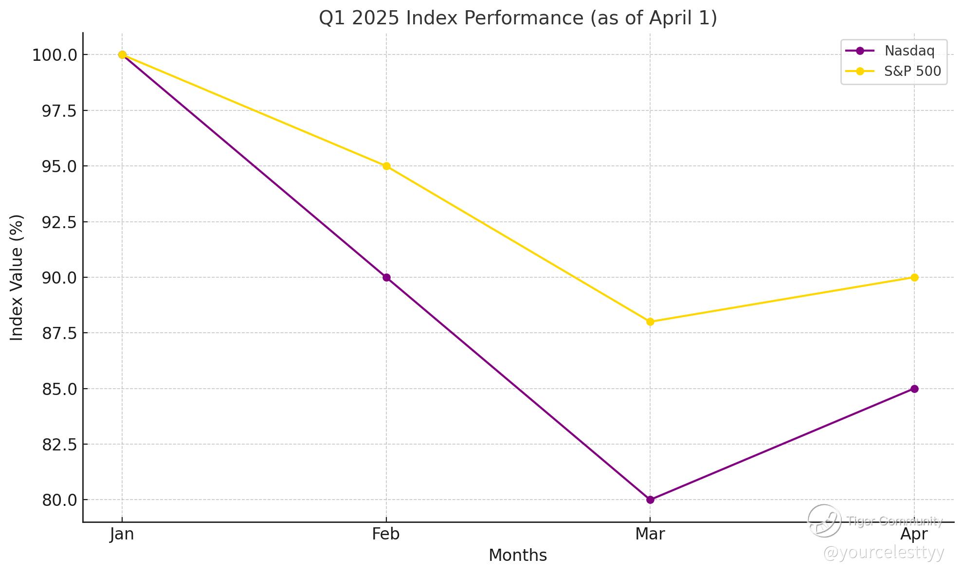 Q1 2025 index performance for the Nasdaq and S&P 500 as of April 1