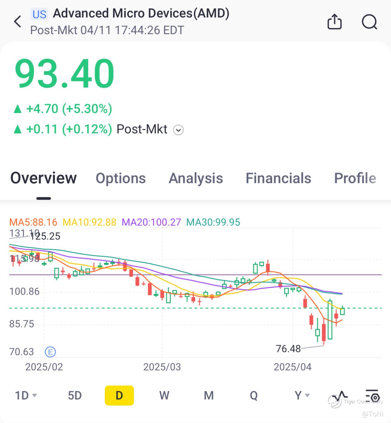 Advanced Micro Devices (AMD) has been making waves in the semiconductor industry, and as of April 11, 2025, the stock looks primed for a significant upward trajectory. With a closing price of $93.40—up 5.30% on the day—and a post-market gain of 0.26%, AMD is showing strong momentum. Backed by robust financials, a promising AI strategy, and a favorable analyst outlook, there are compelling reasons to be bullish on AMD. Let’s dive into why this stock could be a standout performer in the coming months.
