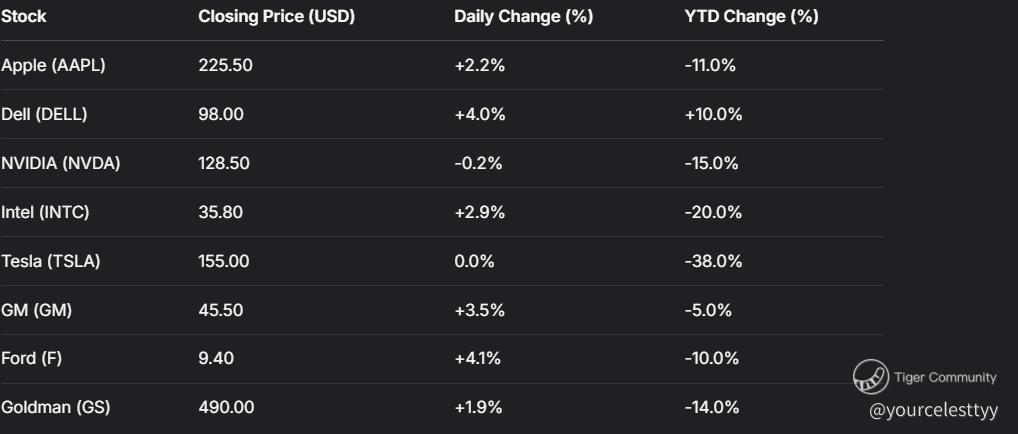 Markets were abuzz on April 14, 2025, as a slew of positive developments drove gains across tech, automotive, and financial sectors. The U.S. Customs and Border Protection Agency’s decision to exempt key electronics from tariffs lifted stocks like Apple, Dell, and NVIDIA, while Intel surged on a major deal. Meanwhile, General Motors and Ford rallied on hopes of an automotive tariff pause, and Goldman Sachs impressed with strong Q1 earnings. Let’s break down these moves, analyze the implications, and see where the opportunities lie.