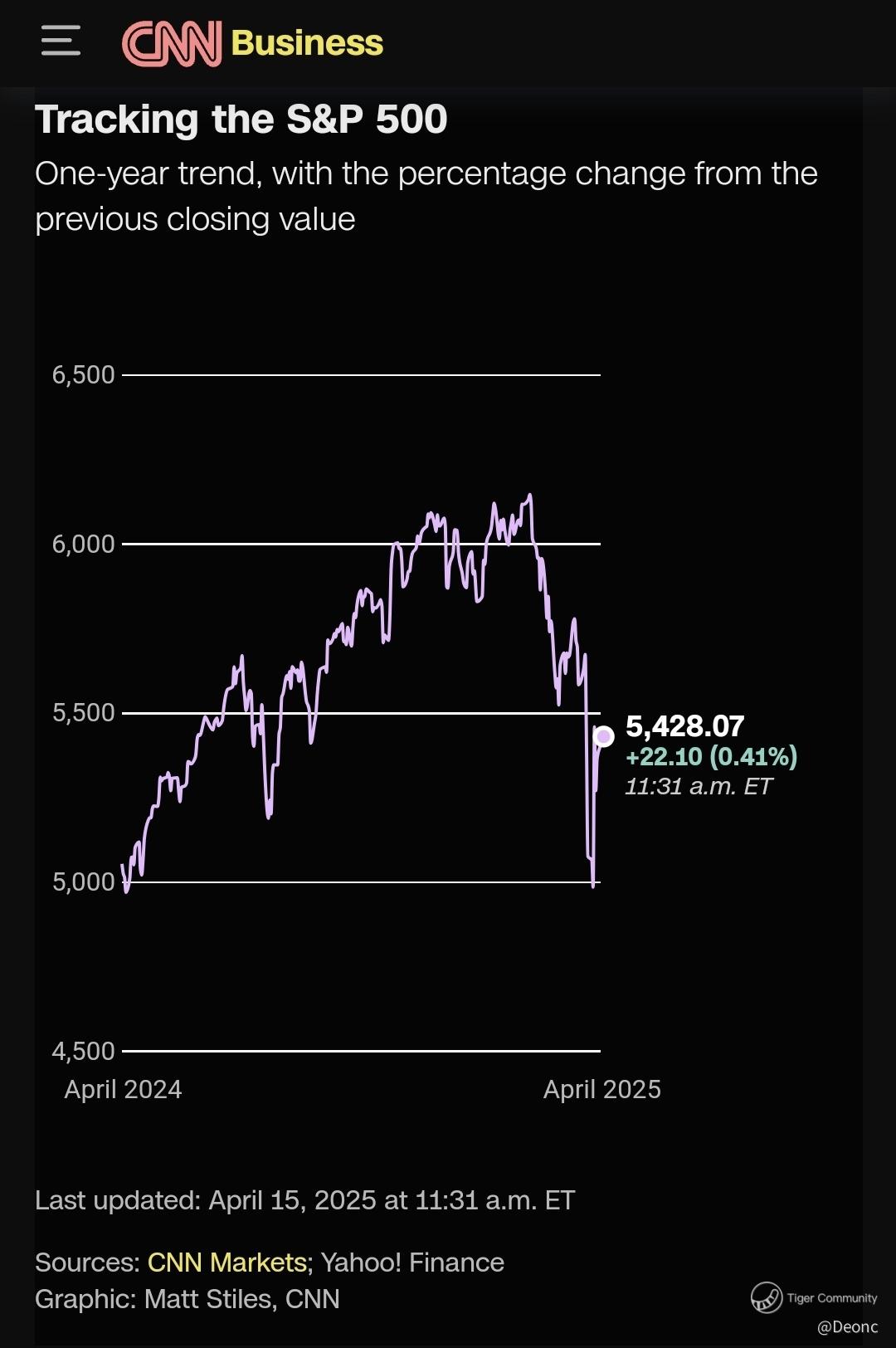 The S&P 500 fell 9% across the first week of April, its worst week since 2020, before rallying 5.7% the second week of April, its best week since 2023. The stock market on Wednesday posted its third-biggest single-day gain in modern history after Trump announced a 90-day pause on most “reciprocal” tariffs. Despite the surge, the S&P 500 is still trading below its closing price on April 2, just before Trump initially announced the reciprocal tariffs.