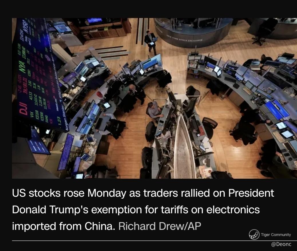 While stocks gained, confusion lingers around the trade war with China: Commerce Secretary Howard Lutnick on Sunday said the exemptions for electronics are only a temporary reprieve. Those products will face separate levies, according to Lutnick.