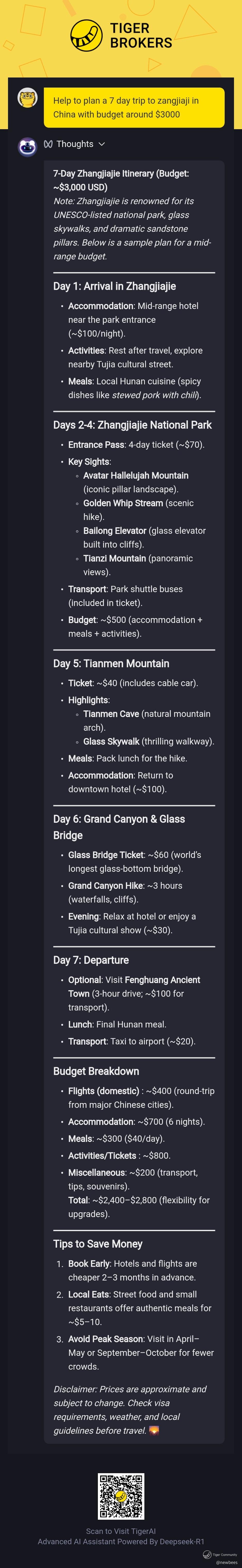 7 day Zhangjiajie trip plan by AI tiger deep seek
