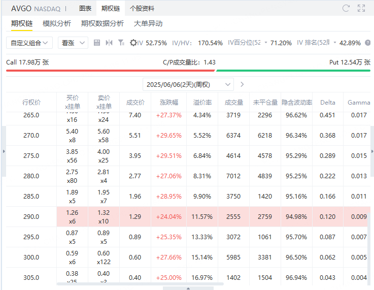 In the upside direction, investors can sell a call option with an exercise price of $290 expiring on June 6 and get a premium of $129.