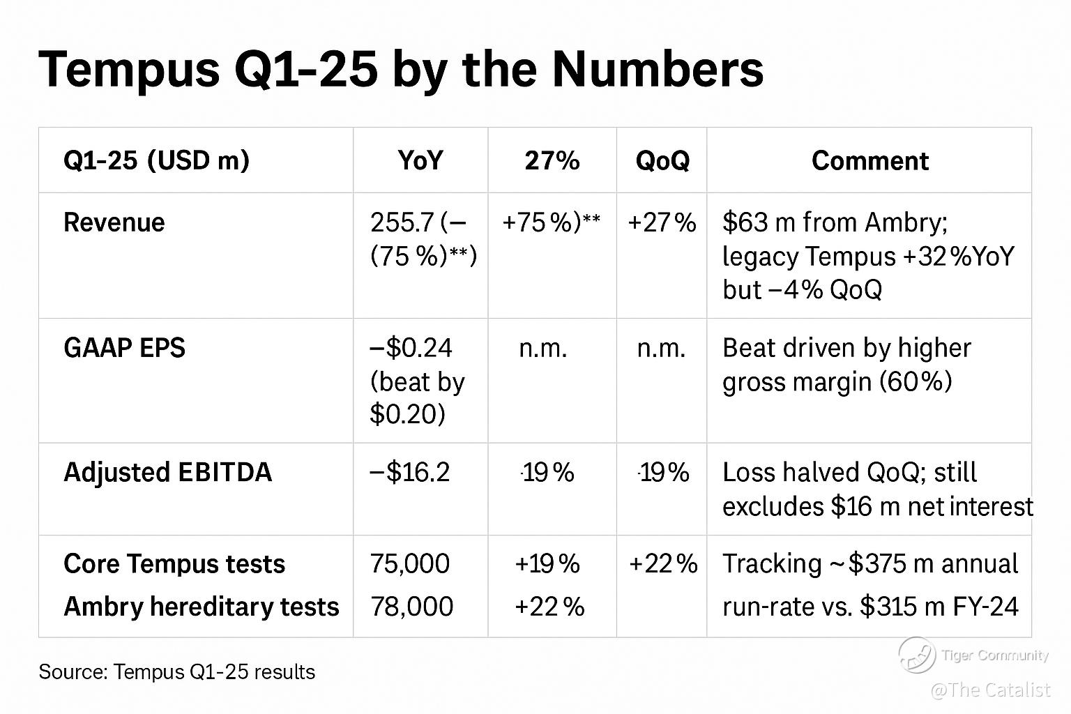 Tempus just printed a 75 % headline revenue jump—and only ~⅓ of that was organic. The Ambry Genetics tuck-in plus a fresh $200 m AstraZeneca work-order propelled backlog past the $1 billion mark, but the core oncology engine actually stepped sideways versus Q4.