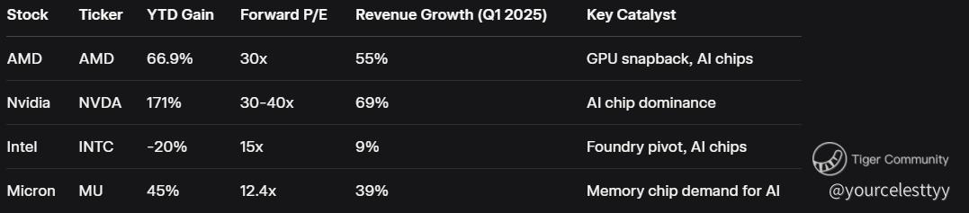 AMD’s rally is impressive, but how does it stack up against peers? Here’s a look at key chip stocks: $Advanced Micro Devices(AMD)$ $NVIDIA(NVDA)$ $Intel(INTC)$ $Micron Technology(MU)$