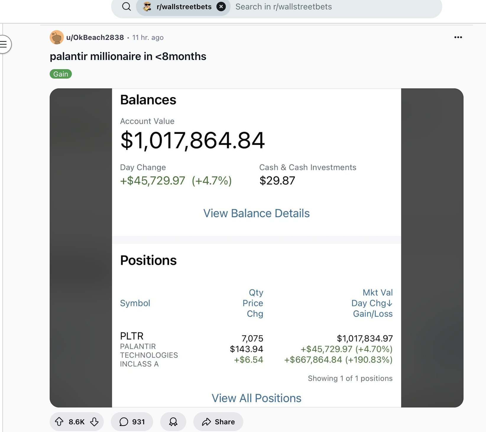 Meanwhile, $Palantir Technologies Inc.(PLTR)$ has been hitting new highs lately, and someone even shared that Palantir turned them into a millionaire in just 8 months.