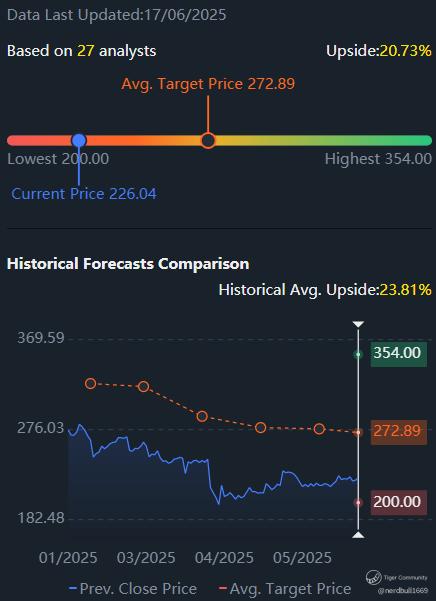 Based on 27 analysts from Tiger Brokers offering 12 month price targets for FedEx in the last 3 months. The average price target is $272.89 with a high forecast of $354.00 and a low forecast of $200.00. The average price target represents a 20.73% change from the last price of $226.04.