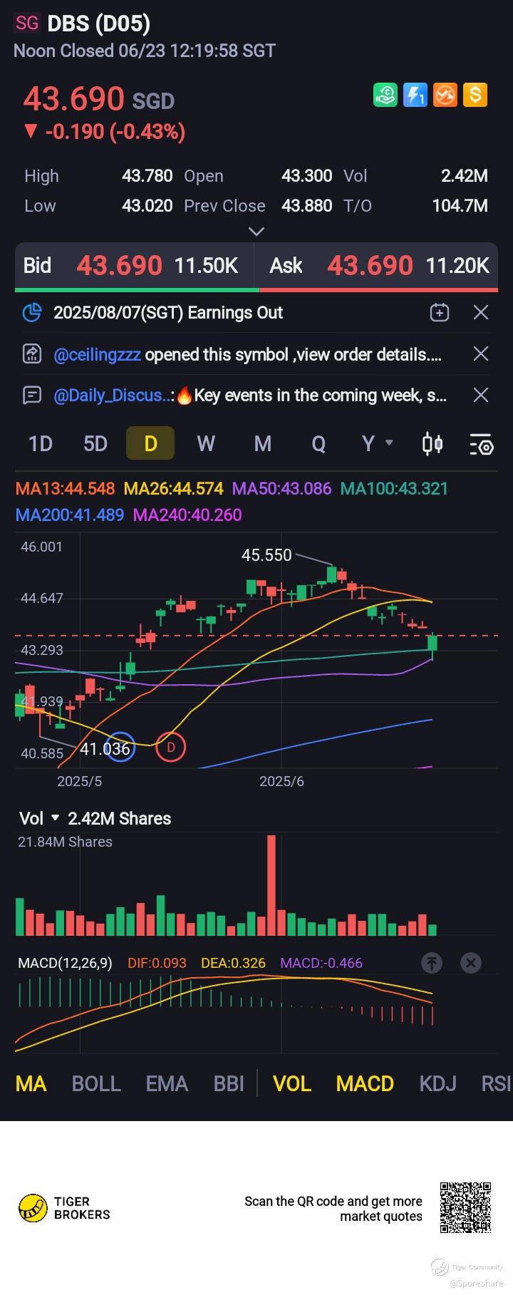 $DBS(D05.SI)$ DBS Bank - As expected, price is down due to war but I think the dividend may likley support the price at current price of 43.40 with an yield of 6.91 percent!