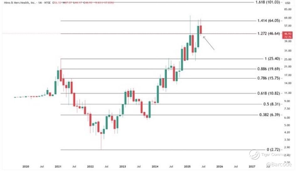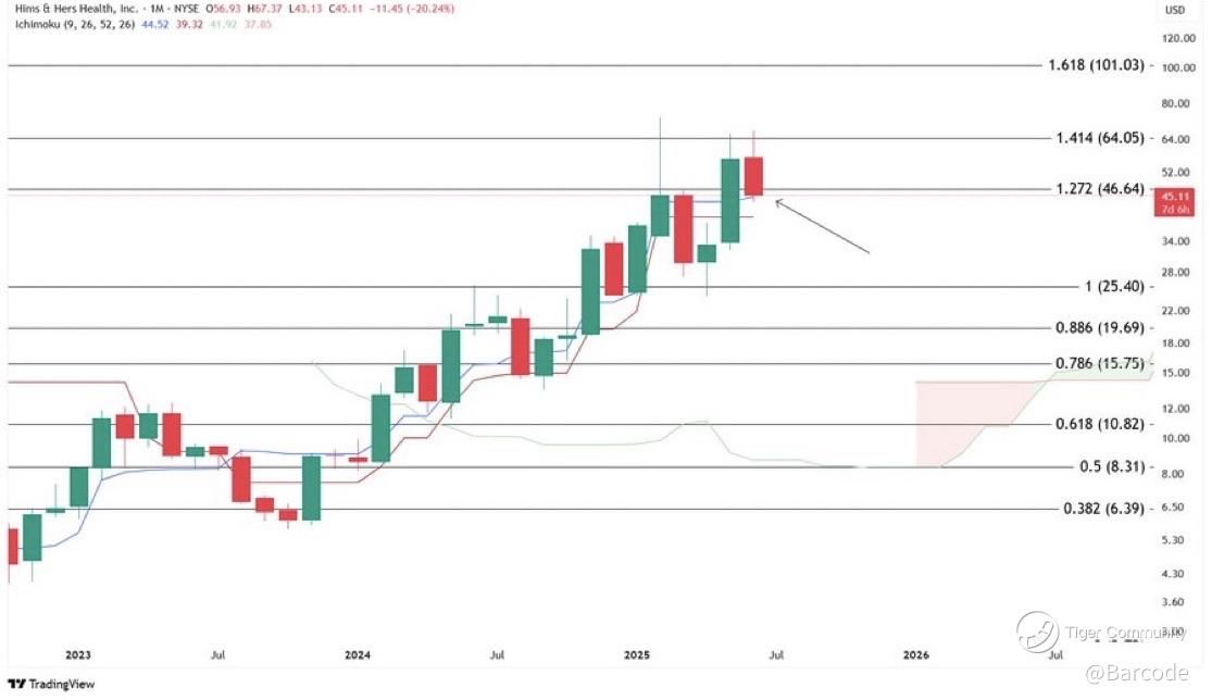 HIMS dropped below the 1.272 Fibonacci extension at $46.64, hitting a low of $43.13 before bouncing slightly. The daily and monthly charts offer two key zones to monitor: