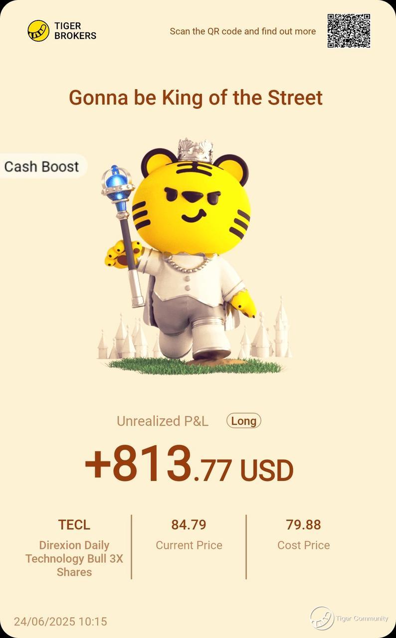 $Direxion Daily Technology Bull 3X Shares(TECL)$ 's 3X leveraged ETF truly lives up to its reputation! A modest tech rebound translated into $813.77 profit. That move from 79.88 to 84.79, amplified perfectly by leverage, shows how to properly ride tech rallies. Sometimes these sector ETFs with built-in leverage outperform individual stock picking with less stress.