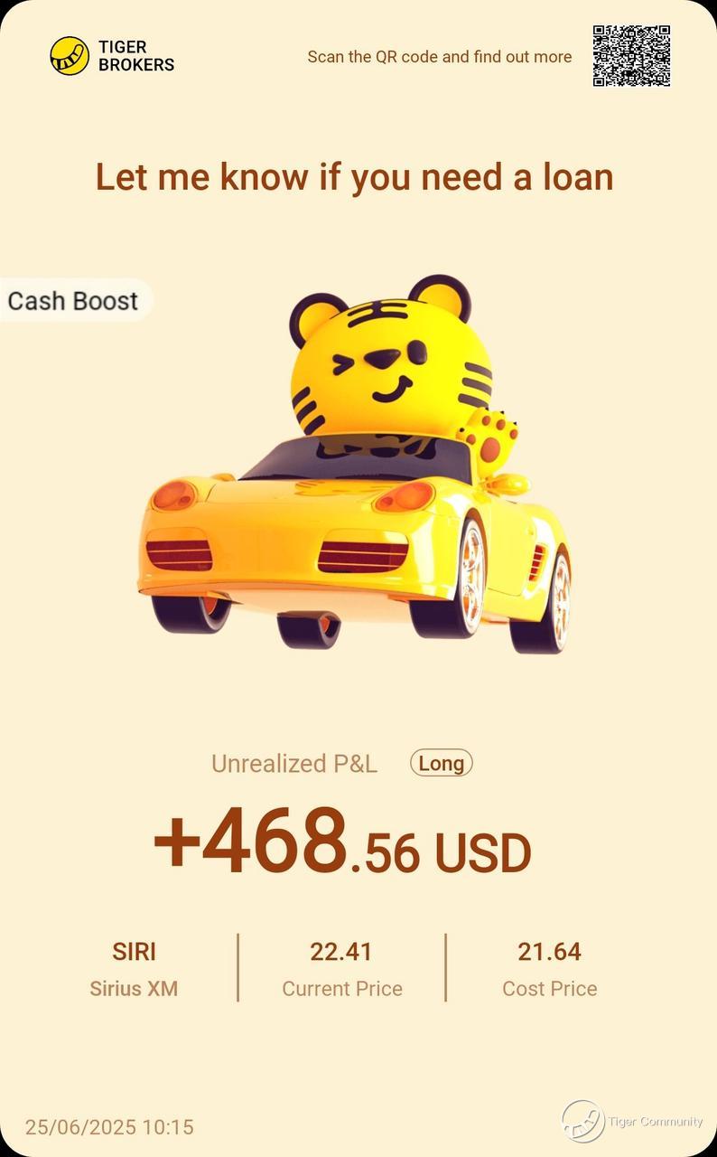 $Sirius XM(SIRI)$ Sweet SIRI returns! My $21.64 entry now worth $22.41, booking $468.56 profits. The satellite radio leader's moat in audio content deepens, while car penetration drives growth. Quality companies at sensible valuations consistently reward investors!
