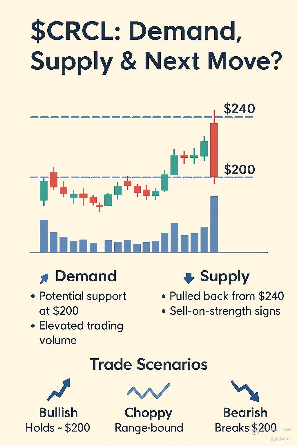 $CRCL is in a critical demand/supply battle. A hold above $200 could validate new buyers and spark a rebound, but a breakdown threatens deeper retracement. Evaluate position sizing and triggers carefully this week.