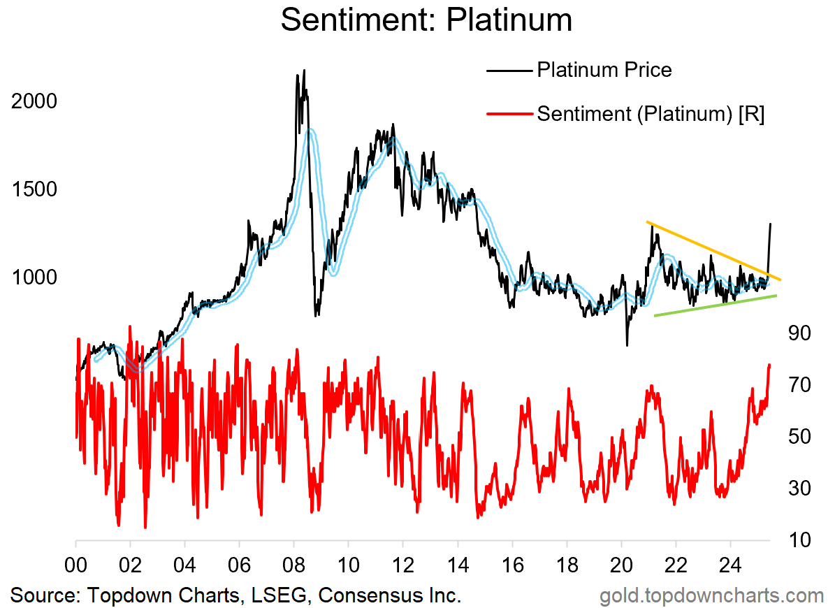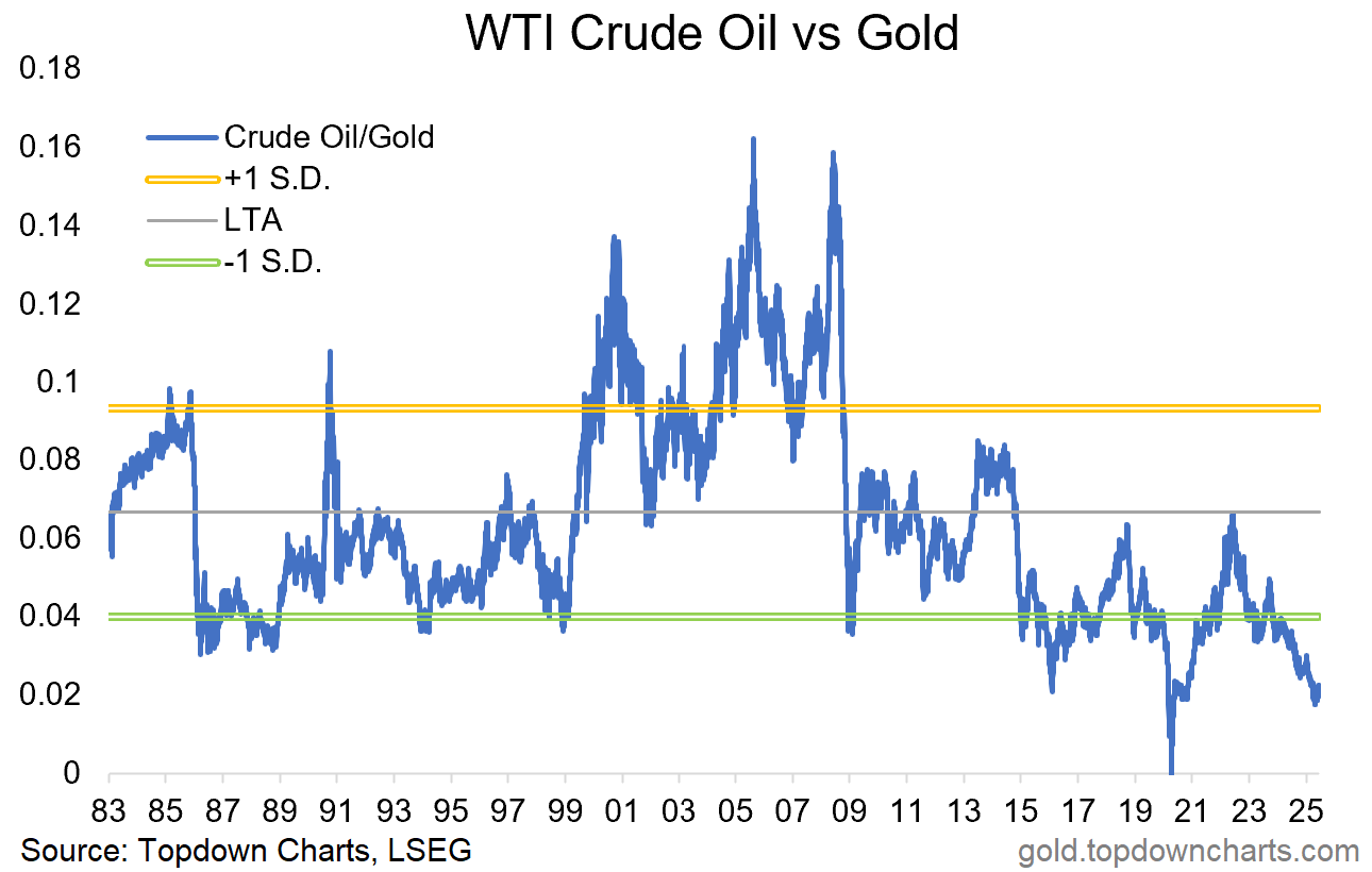 This way of looking at it is insightful because it shows how the extreme level in the chart above has arisen due to both legs (i.e. crude oil making major relative lows vs other commodities, and gold making major relative highs — and both seeing initial exhaustion of both moves).
