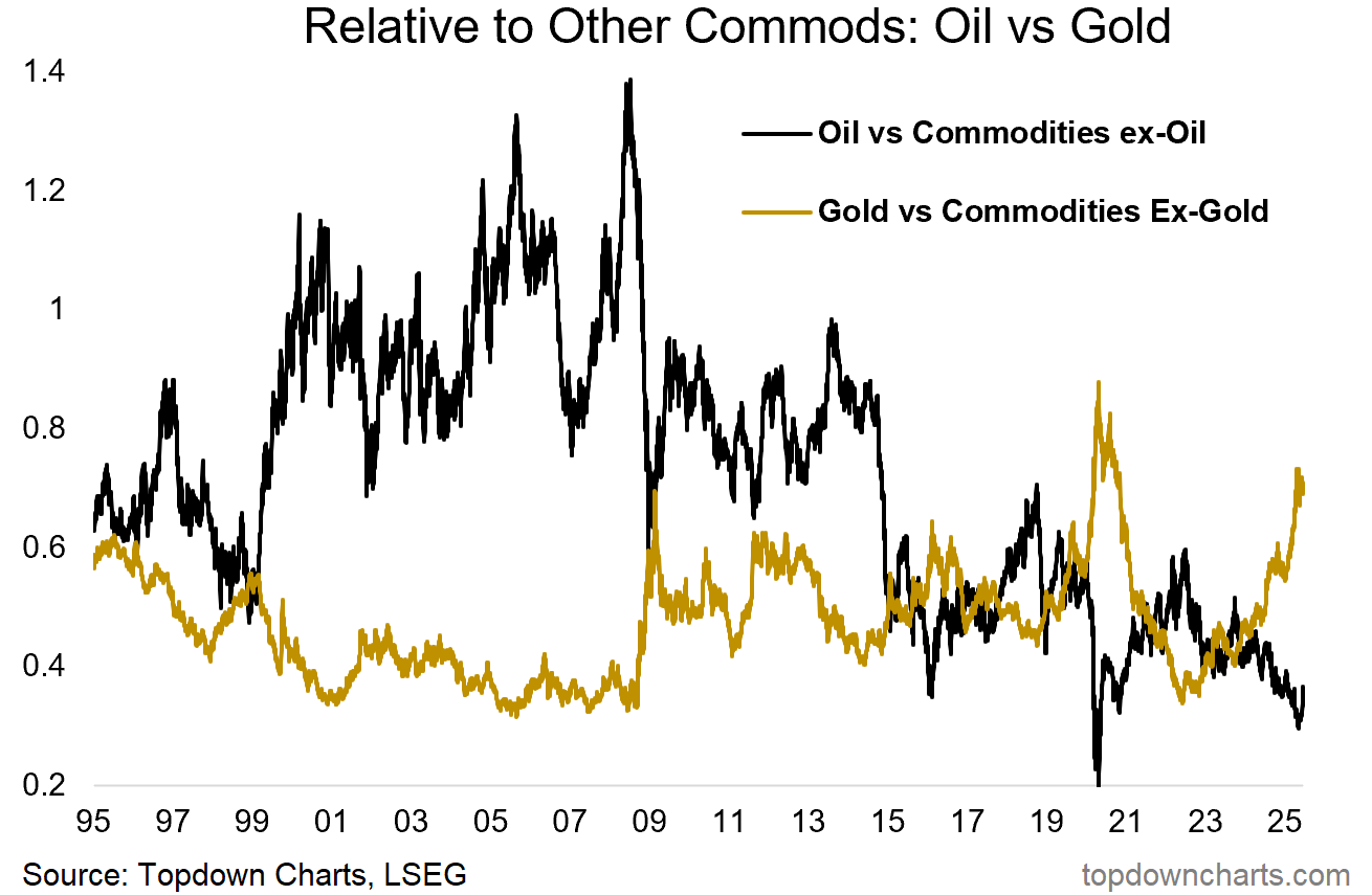 Here’s another angle on it, but breaking it out into Crude Oil vs other commodities (equal-weighted) and the same for gold.