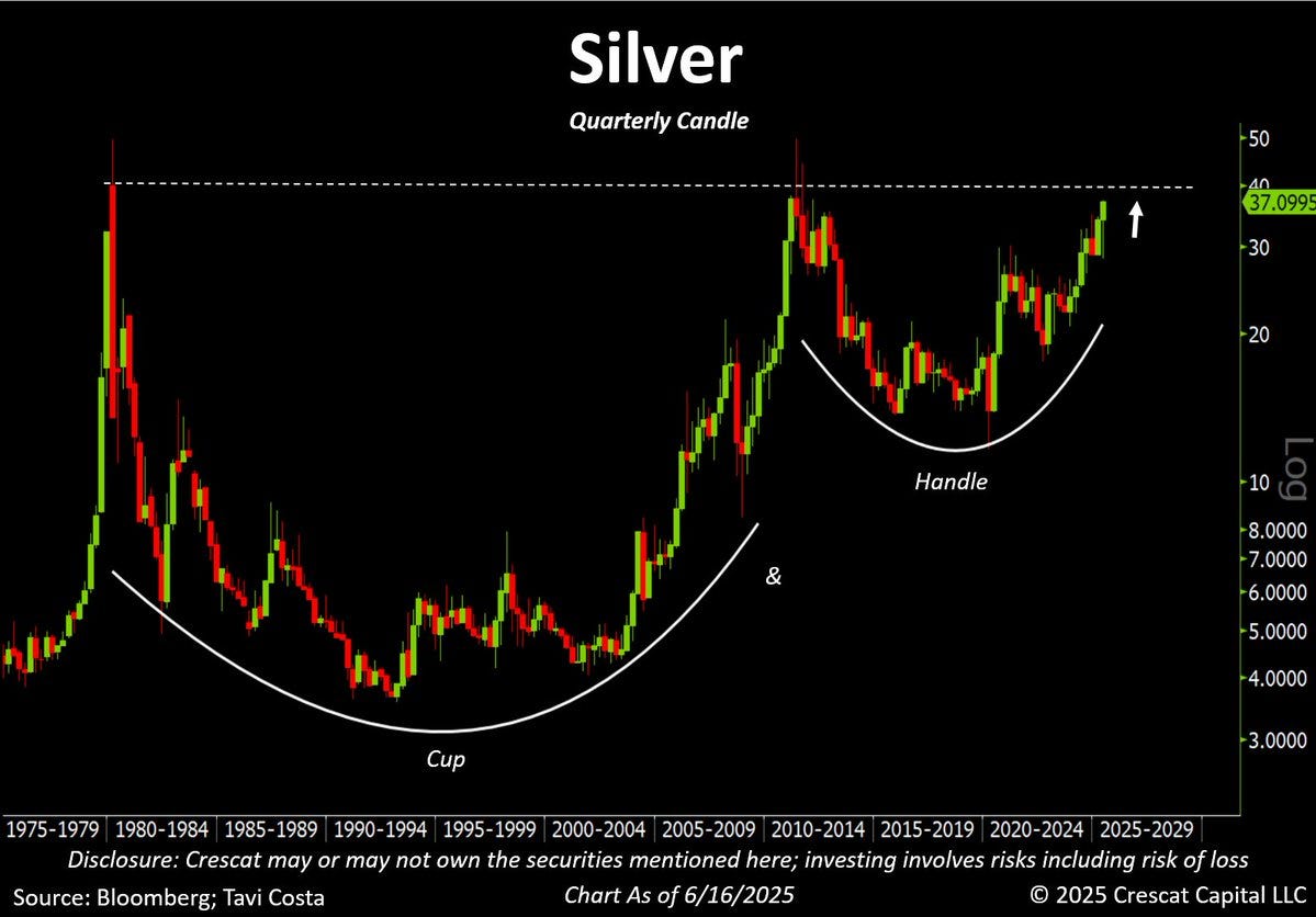 Elsewhere, Tavi Costa of Crescat Capital comments “Silver is on the verge of a major breakout, in my view, from one of the longest cup-and-handle formations I’ve ever seen.“