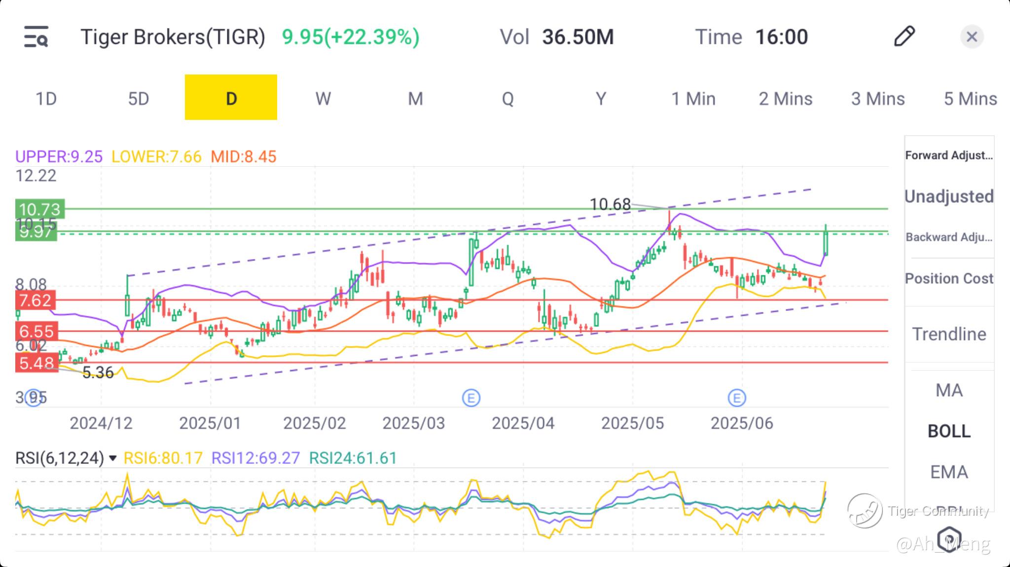 Not sure where this will me. I know from the BOLL indicator shared below that $Tiger Brokers(TIGR)$ had jumped too fast, too much. This is likely to follow with a correction. I am not concerned at this stage as if the recent history of 🐯 is any guide, this cycle of uptrend is far from over. So, it's not just about the overall uptrend. The immediate cycle is also still very much intact.