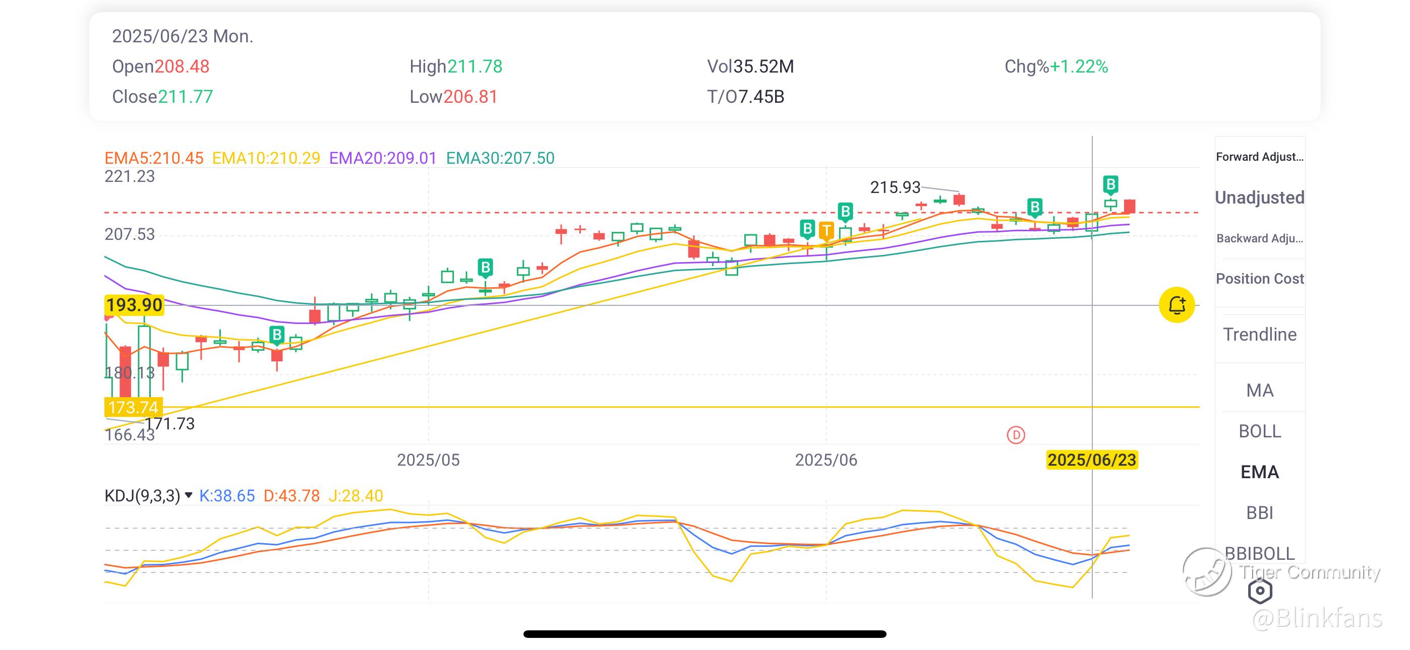 IWM had shown clear resilience, staying above its 20-day and 30-day exponential moving averages. But at $208, I felt there was still short-term volatility due to macroeconomic uncertainty and overbought KDJ signals (K: 38.65, D: 43.78, J: 28.40), which hinted at potential sideways movement. So rather than chasing the price, I positioned myself with a $209 strike put, just slightly below the closing price. This way: