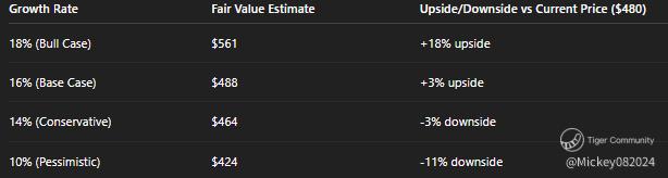 In our base case, we’ve assumed a 16% long-term free cash flow growth rate, in line with Microsoft’s historical averages. At that rate, intrinsic value is around $488, suggesting only a small 3% upside from the current price — essentially in “fair value” territory.