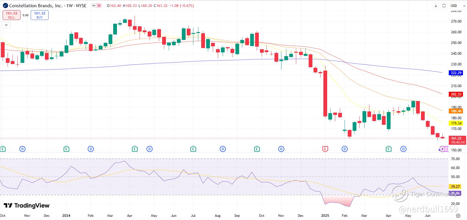 If we consider STZ, we are seeing RSI and also its share price dropping below the 26-EMA key level on the weekly timeframe, if we were to consider it without the oversold RSI and institutional backing, this stock would not be in my radar. But we could see a sharp rebound if the institutional backing going to come strong.
