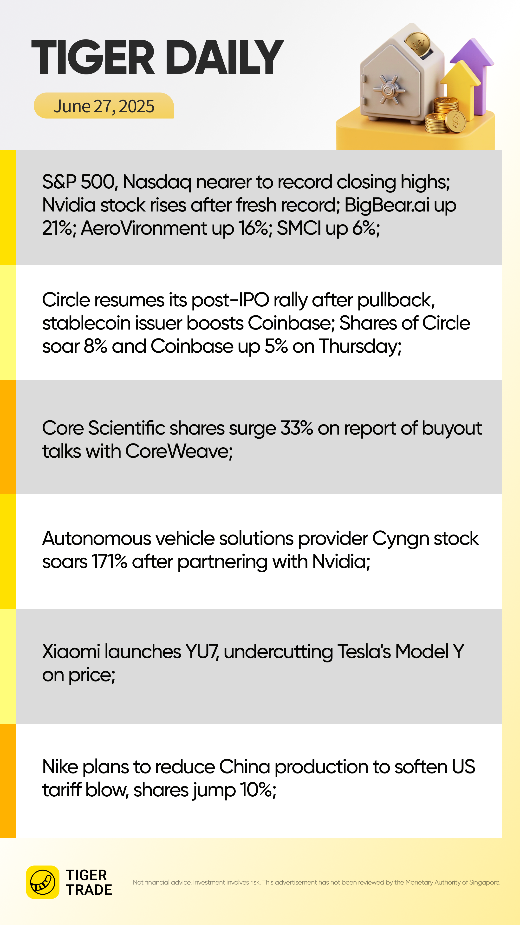 Coinbase, the cryptocurrency exchange, was up 5.5% after rising 3.1% on Wednesday to $355.37, the stock's highest close since Nov. 9, 2021, according to Dow Jones Market Data. Coming into Thursday, Coinbase has soared 54% in June, putting it on pace for its best month since November 2024. The company has benefited from Senate passage of the Genius Act, a bill clarifying how stablecoins are regulated.