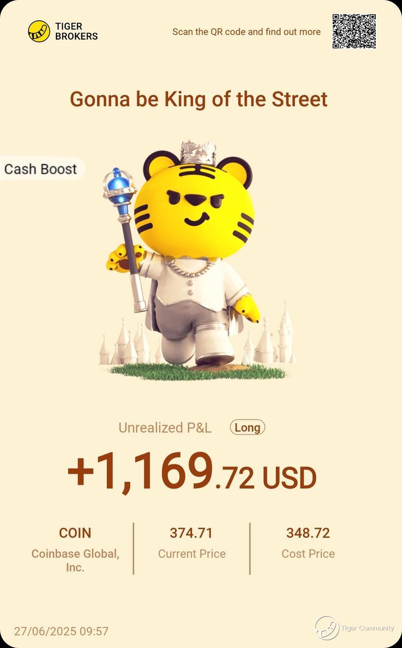 $Coinbase Global, Inc.(COIN)$ goes parabolic! $1,169.72 gains as price rockets from $348.72 to $374.71! The crypto exchange king is crushing it with institutional custody boom and ETF-driven volumes. This crypto renaissance is just getting started - HODL tight!