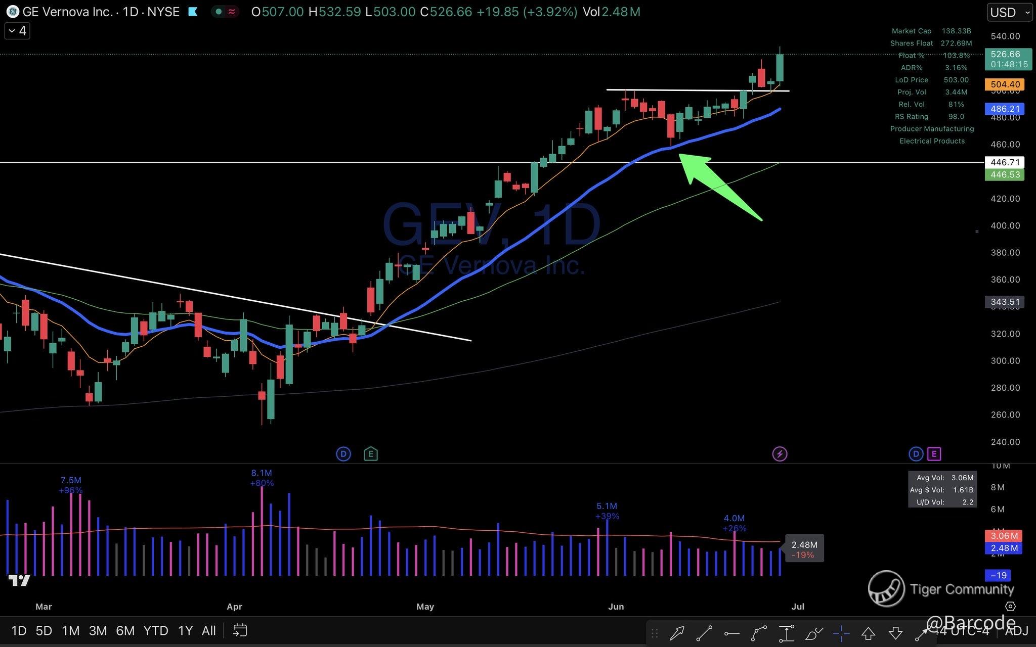 Price is currently trading near $523.90, up 3.28 %, with a recent high of $532.59. $GEV checked back to the 21 EMA before breaking out cleanly, with price riding the 10 day moving average in textbook trend structure. Volume is building steadily and MACD continues to widen. RSI 6 sits around 87 with no divergence.