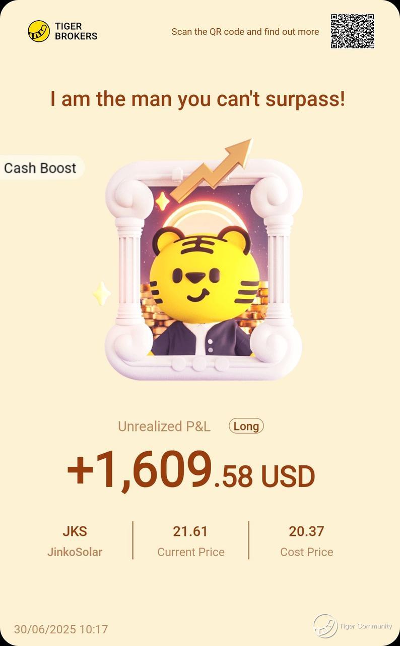 $JinkoSolar(JKS)$ I am the man you can’t surpass! JinkoSolar just delivered an unrealized profit of +1,609.58 USD! With a cost price of 20.37 USD and current price at 21.61 USD, this win screams the power of conviction. The market rewards those who dare to hold their ground. Keep dominating—the charts don’t lie!