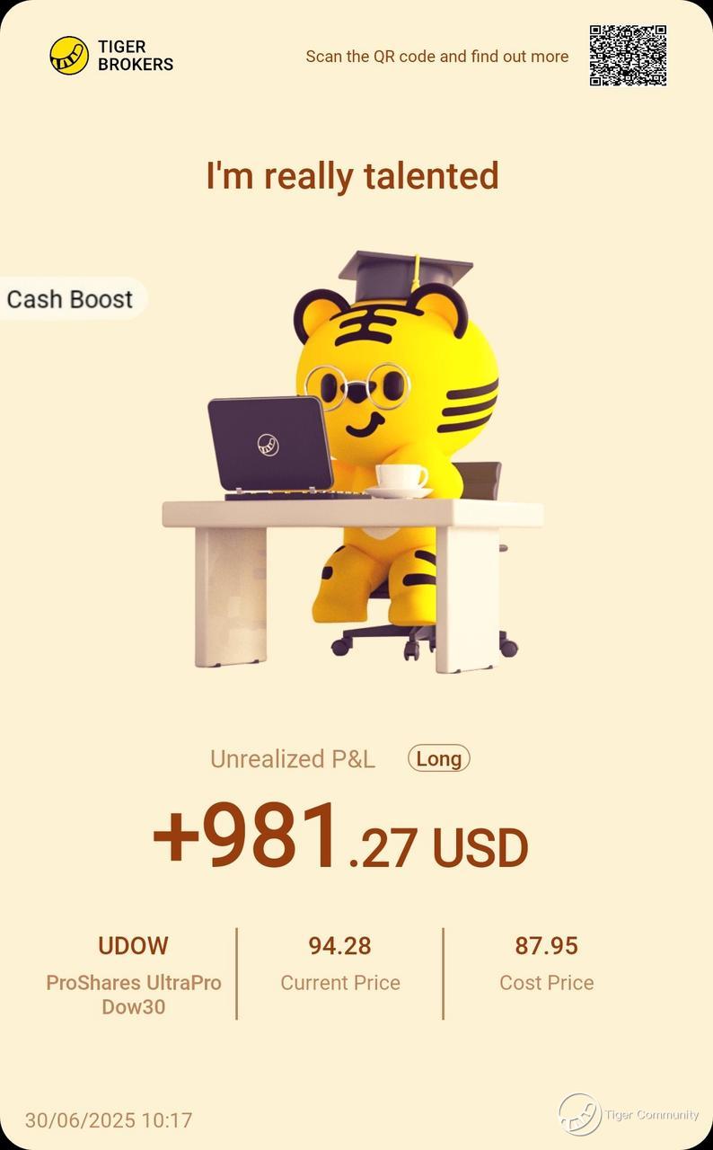 $ProShares UltraPro Dow30(UDOW)$ I'm really talented—and the numbers prove it! My unrealized P&L for ProShares UltraPro Dow30 has soared to +981.27 USD! With a cost basis of 87.95 USD and current price at 94.28 USD, this leveraged play is firing on all cylinders. Timing + execution = undeniable results. Luck? Nah, this is pure skill. Onward to the next victory lap!