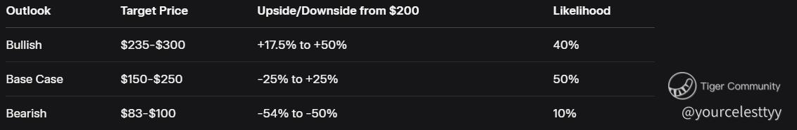 Base Case ($150-$250): Balances growth potential with valuation risks, likely if regulatory progress stalls or profit-taking continues. The $200 support level is critical, with $150 as a near-term floor and $250 as a reasonable upside if momentum resumes.