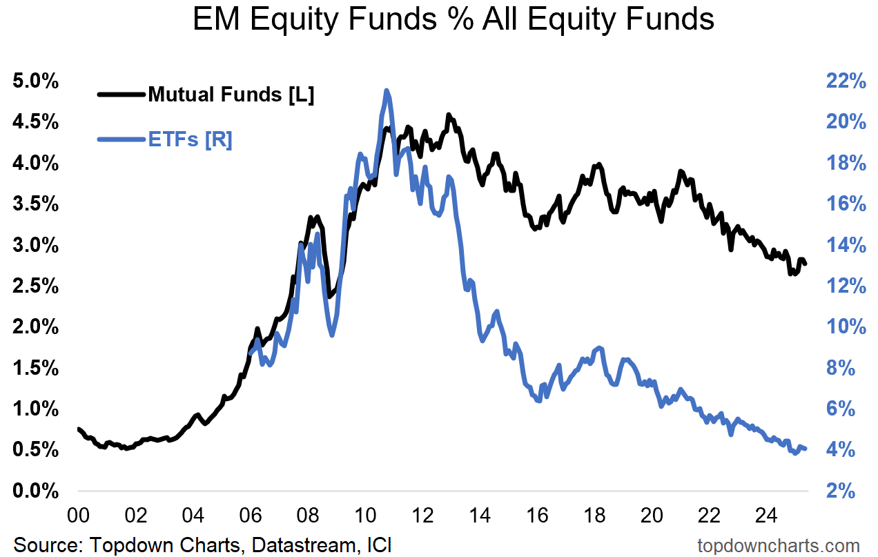 This chart shows the market share of dedicated emerging market equity funds in both the US mutual fund market and ETF market — we can think of this as the implied allocation by investors to emerging market equities (in the aggregate).