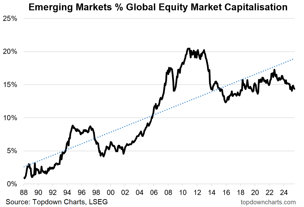 But really the key point is investors are running materially lower allocations than that seen over the past 20 years, and as you’ll see in the next chart… it’s also a fraction of the global market cap weight of EM equities (which is tracking just below 15%).