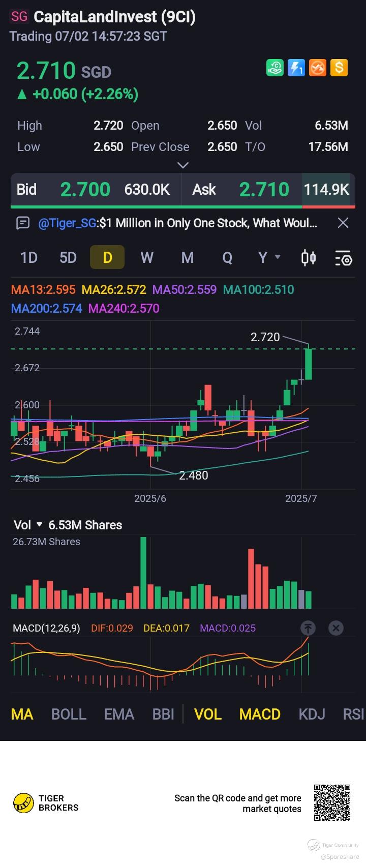CapLand Investment - She is gaining strength likely to test 2.72 . A nice breakout smoothly plus good volume we may see her rising up further towards 2.82 and above !