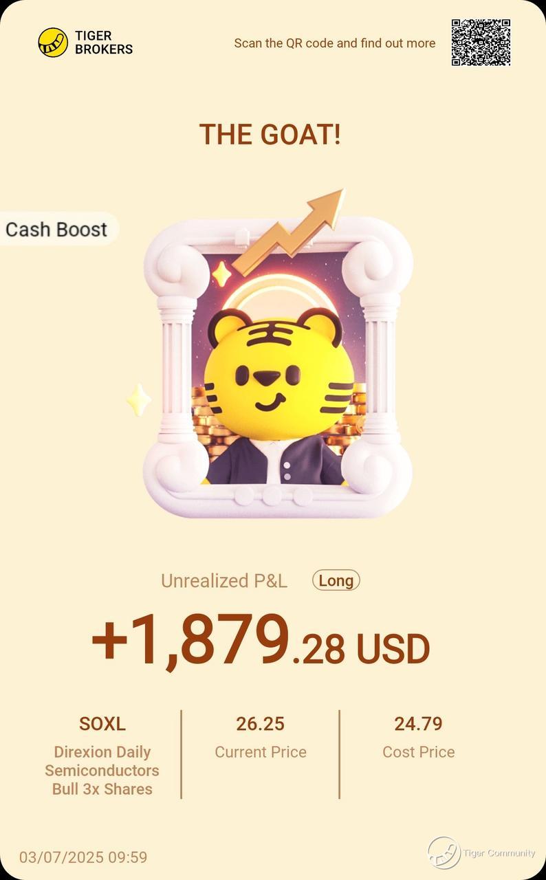 $Direxion Daily Semiconductors Bull 3x Shares(SOXL)$ , the 3x leveraged semiconductor ETF, delivered a massive $1,879 profit in just one day—the chip king is back in full force! From a buy-in at $24.79 to a surge up to $26.25, SOXL posted a 5.9% daily jump. This gain isn’t just luck—it’s the perfect storm of a chip cycle rebound amplified by triple leverage. When momentum hits, nothing can stop it!