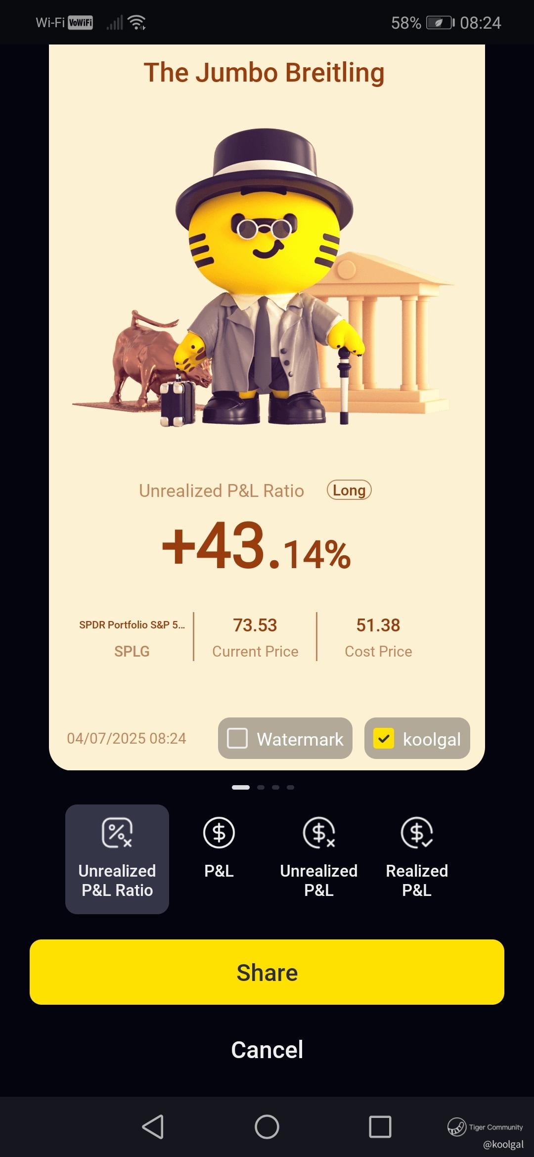SPLG $SPDR Portfolio S&P 500 ETF(SPLG)$ tracks the S&P500 Index, giving instant access to the best and strongest US companies in just 1 trade. SPLG has reached its 52 week high recently at USD 73.66. With a low expense ratio of just 0.02% this ETF puts more money back into my pockets over the long term. My position is 43% and still compounding.