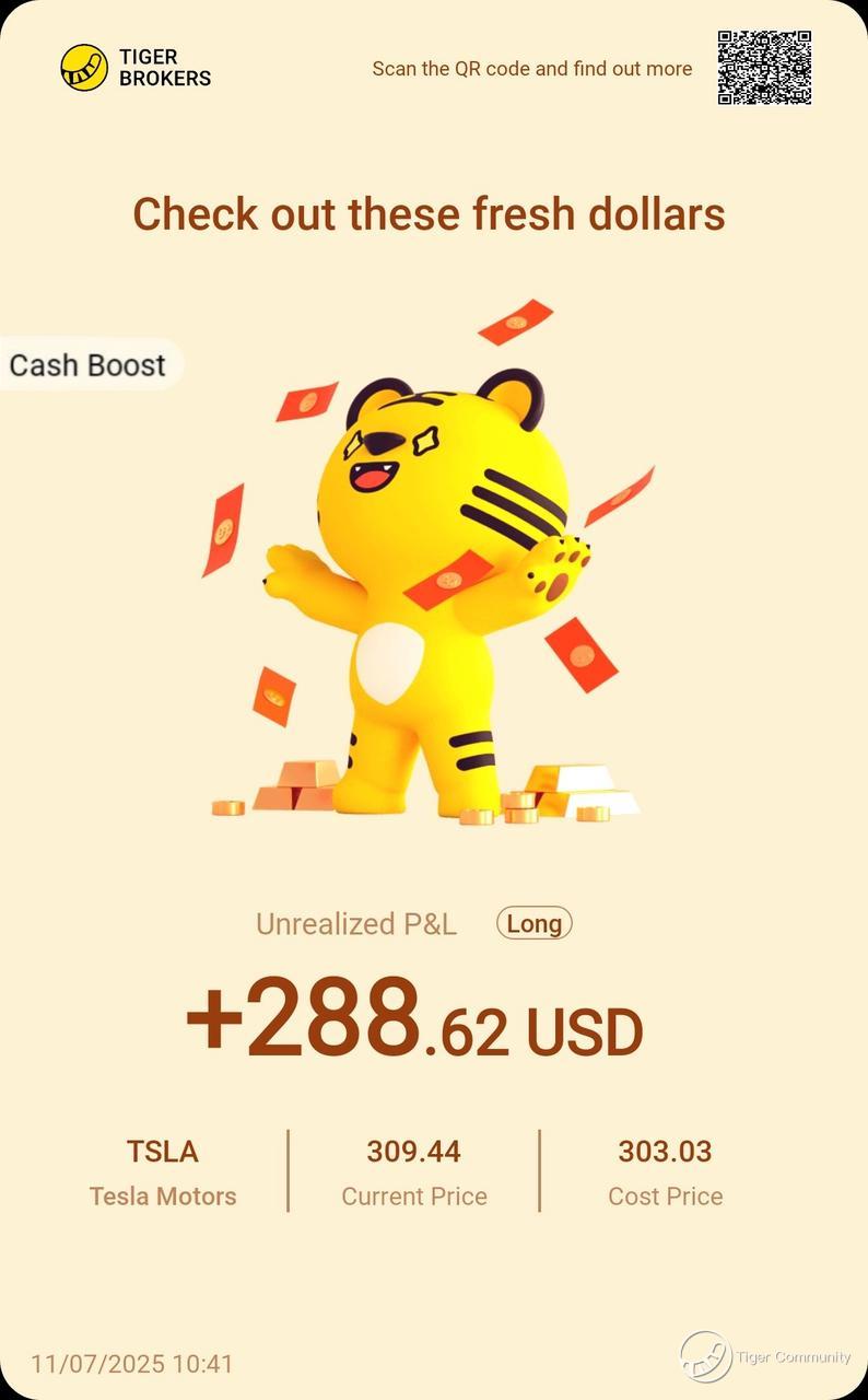 $Tesla Motors(TSLA)$ cruising steady! The stock's wild swings come with the territory - keeping shares for Musk's next moonshot. Wishing fellow investors smooth rides and solid gains ahead!