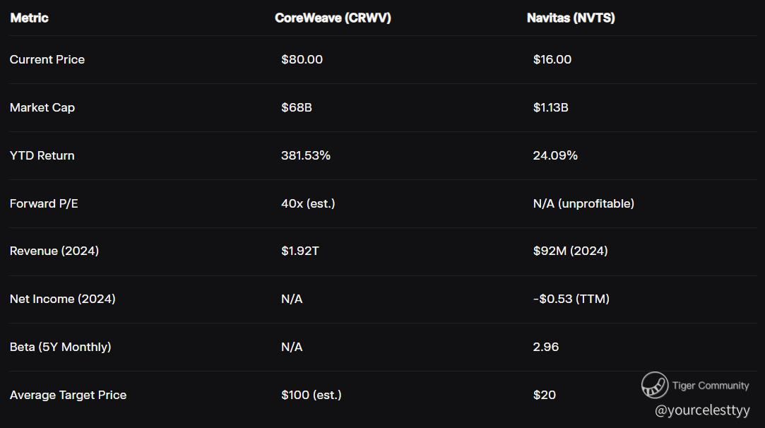 Nvidia Comparison: Nvidia’s 32x forward P/E dwarfs CoreWeave’s estimated 40x and Navitas’s unprofitable status, but their smaller scale offers higher growth potential with greater risk.