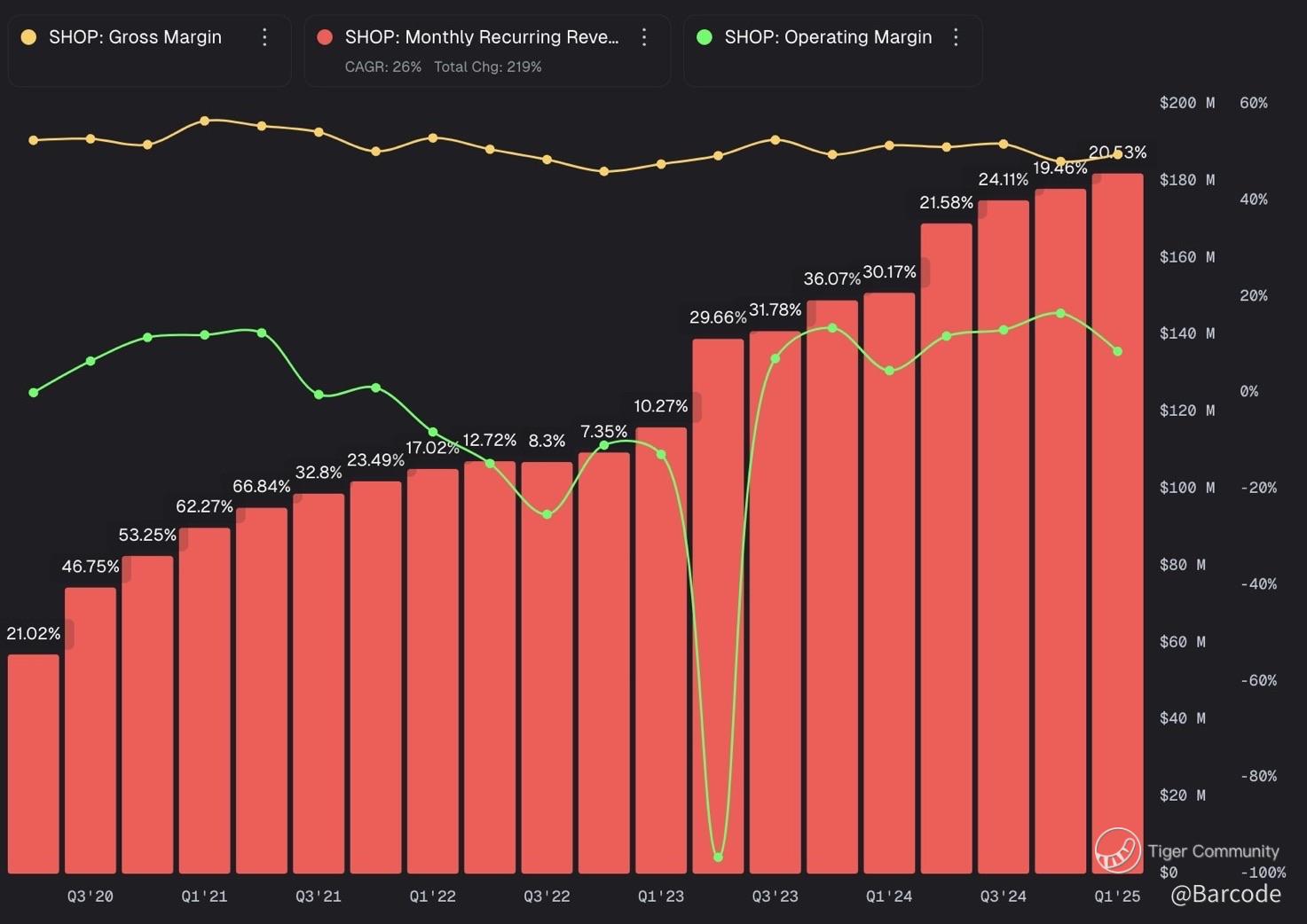 What’s driving it? Not just platform subs. Merchant solutions now make up 74% of revenue and are expanding fast. From Shopify Payments in 16 new markets to tools like TariffGuide.ai, this is no longer just a storefront provider: it’s becoming the OS for global commerce.