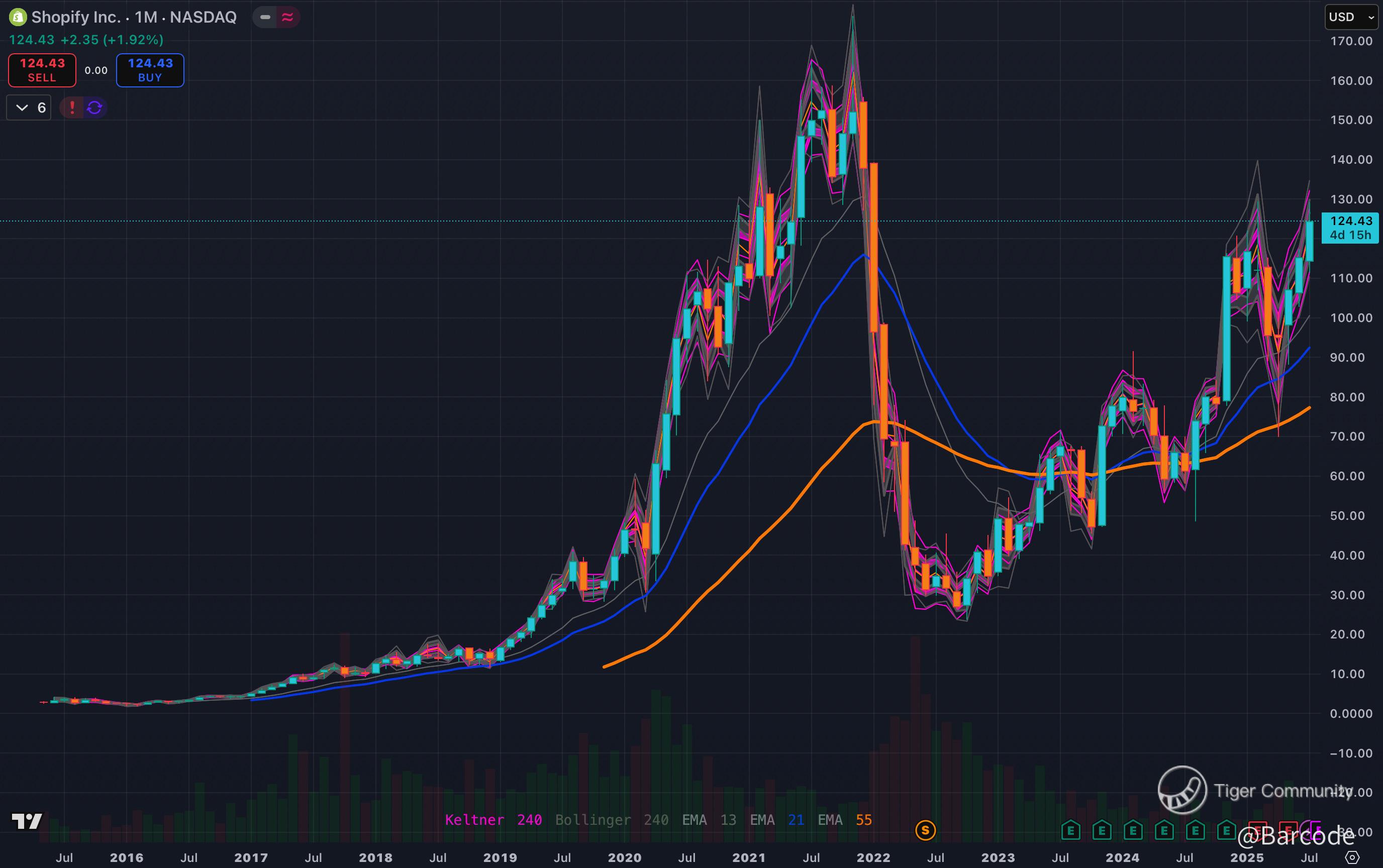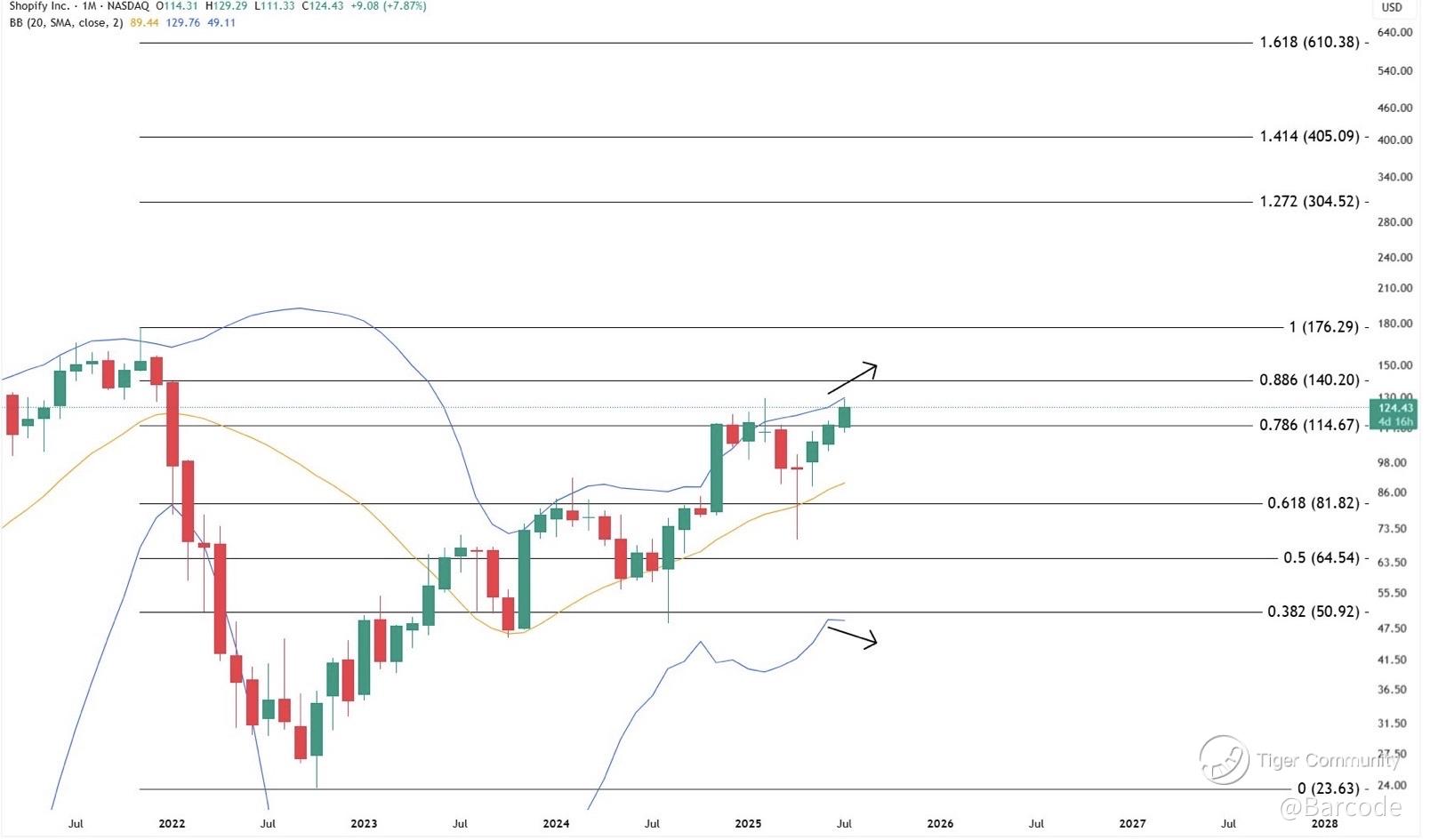 I’m profoundly bullish on $SHOP as it clears the 0.786 monthly log fib level at $114.67 with Bollinger bands starting to expand; signaling the potential for a new impulsive leg higher. With price sitting near $124 and earnings due 06Aug25, momentum into the print could be explosive.