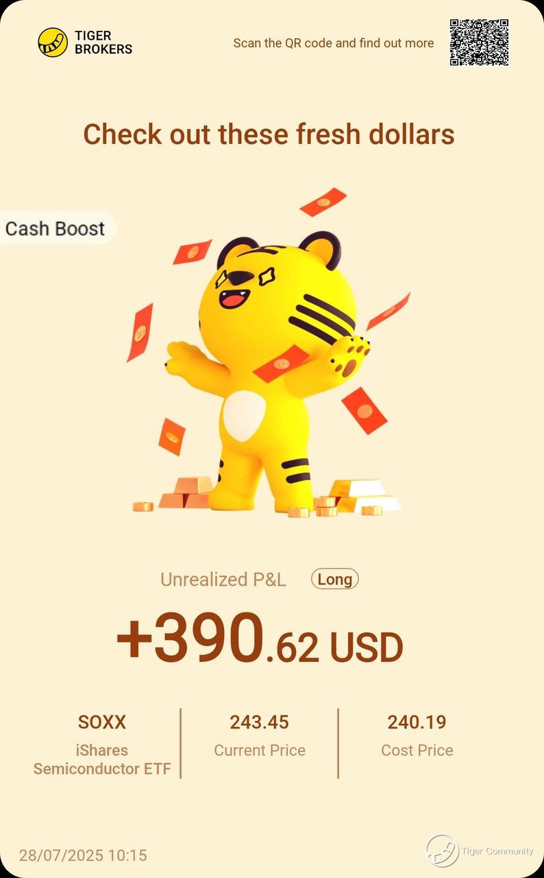 $iShares Semiconductor ETF(SOXX)$ Riding the semiconductor wave with SOXX paid off. AI and chips remain strong themes—holding with confidence. Wishing everyone great returns!