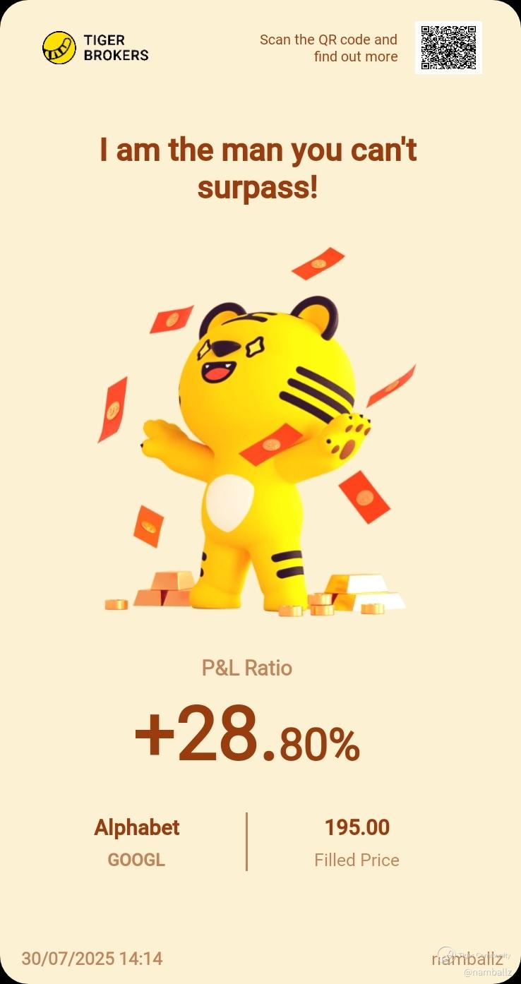$Alphabet(GOOGL)$ solid company, solid CEO, solid Q2. Cashing out in 4 months only because I've hit my TP. It's impressive that they rebounded from AI competition and grew even stronger.
