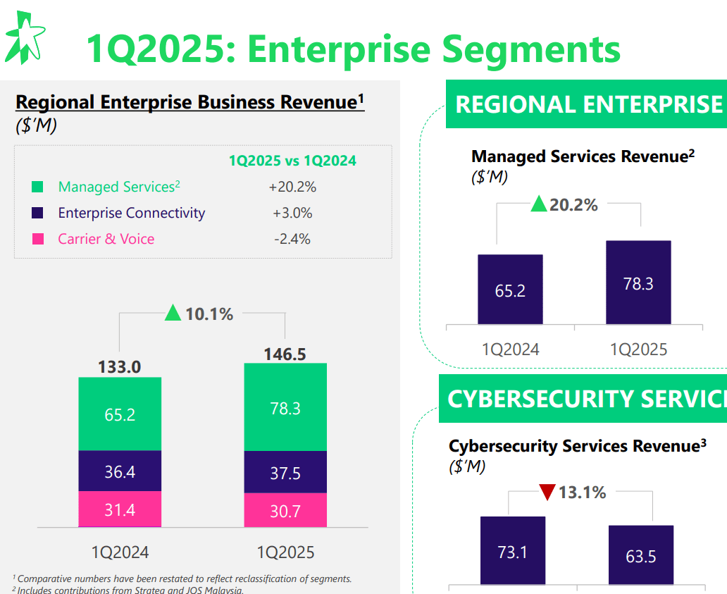 📊 Service revenue totalled S$464 million in Q1 2025, flat YoY, held back by timing issues in the cybersecurity arm, Ensign, while broadband revenue rose ~5% and regional enterprise grew ~10%.