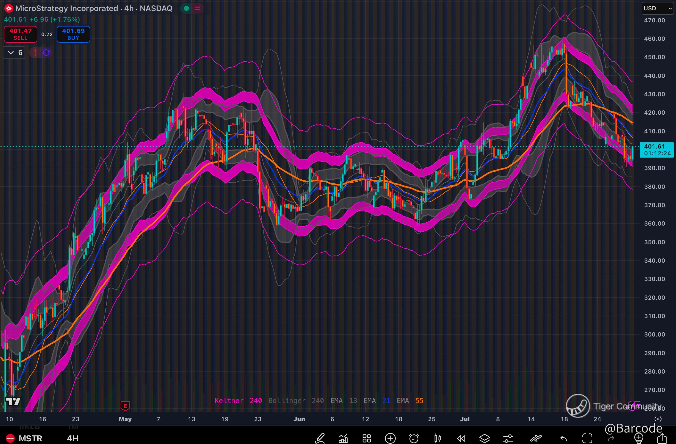 I’m convinced $MSTR is approaching a pivotal convergence of fundamentals and macro tailwinds. It’s compressing at $394.25, pinned against the lower Bollinger and Keltner bands, with resistance at $405 and a breakout trigger at $407. Earnings hit Thursday. Hold $400 and clear $407, and upside toward $431.17 and $451.64 comes into play. Fail that, and the volume shelf doesn’t offer real support until $370. The wedge structure is tight, and resolution is imminent.