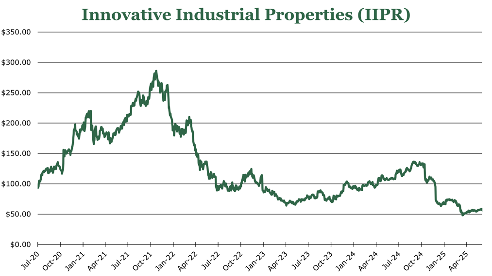 IIPR targets triple-net leases, meaning all property taxes, capital repairs and insurance are all paid by the tenant while occupied. We believe this operating structure is very favorable, even during market downturns. Overall, the cannabis real estate market is a captive one, with cannabis operators usually unable to raise the capital required to self-fund large industrial properties at favorable rates due to cannabis’ status as a schedule I drug. This structure allows for higher margins than traditional REITs, or cannabis operators. As of the quarter ending March 2025, IIPR had an operating margin of 52.3%.