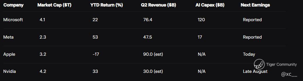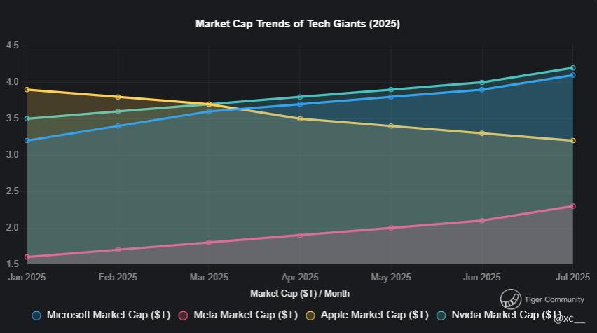 $Microsoft(MSFT)$ The tech world is ablaze as Microsoft rockets past $4 trillion in market capitalization, joining Nvidia as the only two companies to hit this rarefied air. This milestone, sealed with a blockbuster earnings report showing 18% revenue growth and Azure’s $75 billion annual run rate, marks Microsoft as a titan of the AI and cloud era. Meanwhile, Meta stunned with an 11% stock surge after crushing Q2 sales forecasts with $47.5 billion in revenue and a bullish outlook, fueled by its ad business and relentless AI spending plans into 2026. Yet, Apple languishes at $3.2 trillion, down 17% this year, as its AI lag casts a shadow. With the AI battleground heating up, investors are asking: should you hold these giants? Is Nvidia the real winner? Can Apple reclaim its throne? This deep dive explores the stakes, financials, and strategies shaping the next tech elite.