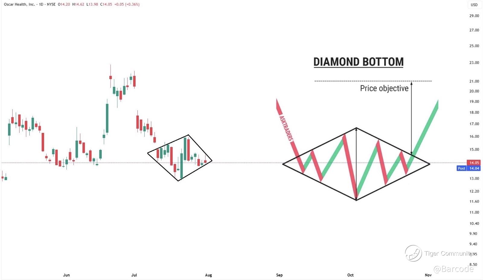 Iβm watching Oscar Health ($OSCR) with growing interest as a rare bullish diamond bottom begins to crystallize on the daily chart. For newer traders, a bullish diamond bottom is a powerful reversal pattern that resembles a widening then narrowing structure, visually like a baseball diamond, marking indecision followed by a sharp resolution. Itβs rare, but when it forms after a steep downtrend and confirms with breakout volume, it often signals explosive upside. The measured move target is typically projected by the height of the diamond added to the breakout point; in this case, it suggests a potential push toward $20β21.