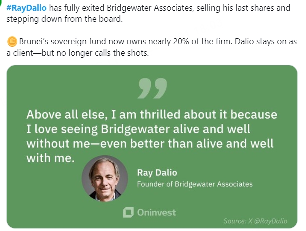 Valuation: Brunei’s sovereign fund just redeemed cash and then turned around to buy a minority stake in the parent—a back-door “IPO-level” price tag. Translation: Dalio cashed out at the absolute peak of brand and scale.